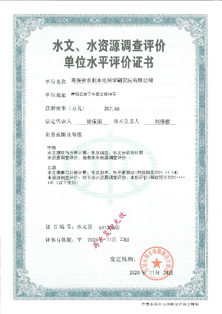• 水文、水資源調查評價資格證書