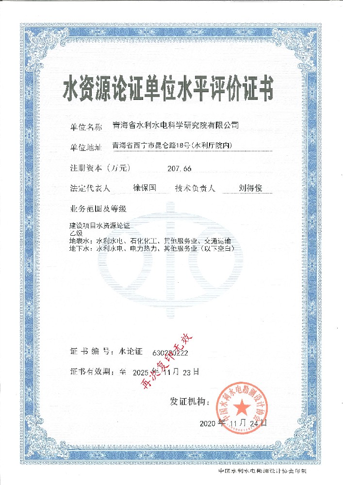 • 水資源論證單位水平評價證書